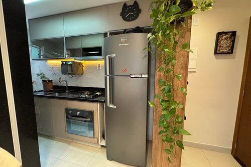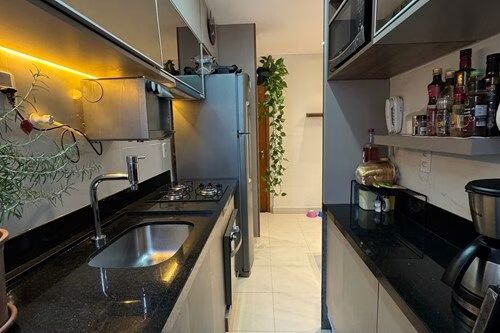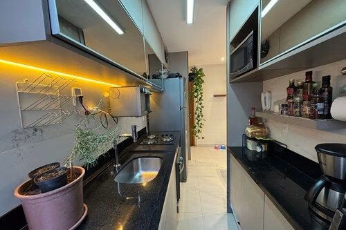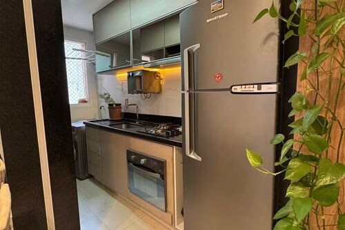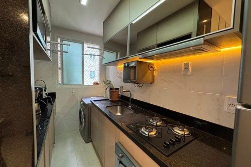 -Cozinha funcional com armários planejados, cooktop, coifa e forno embutidos.